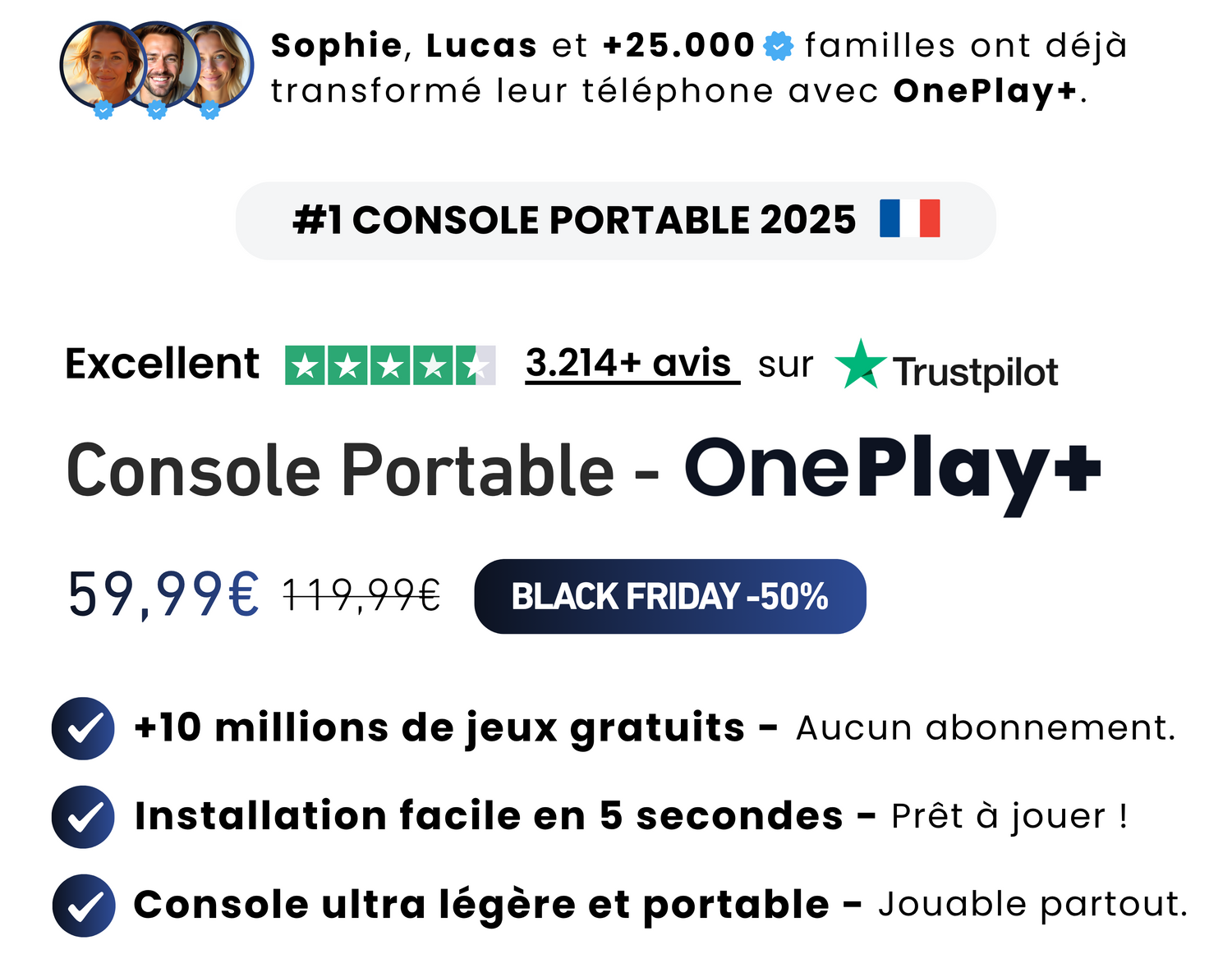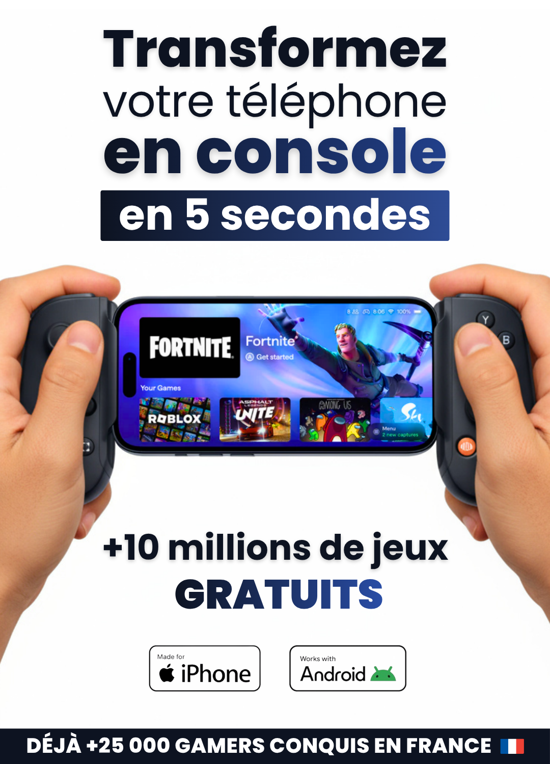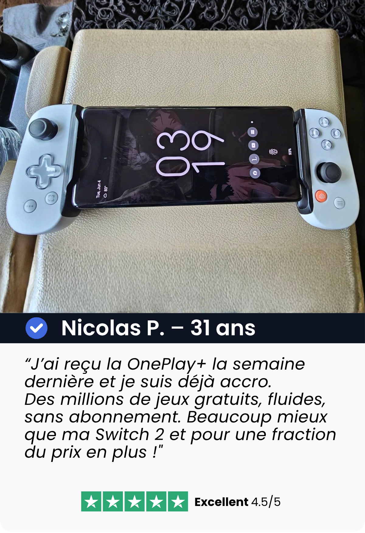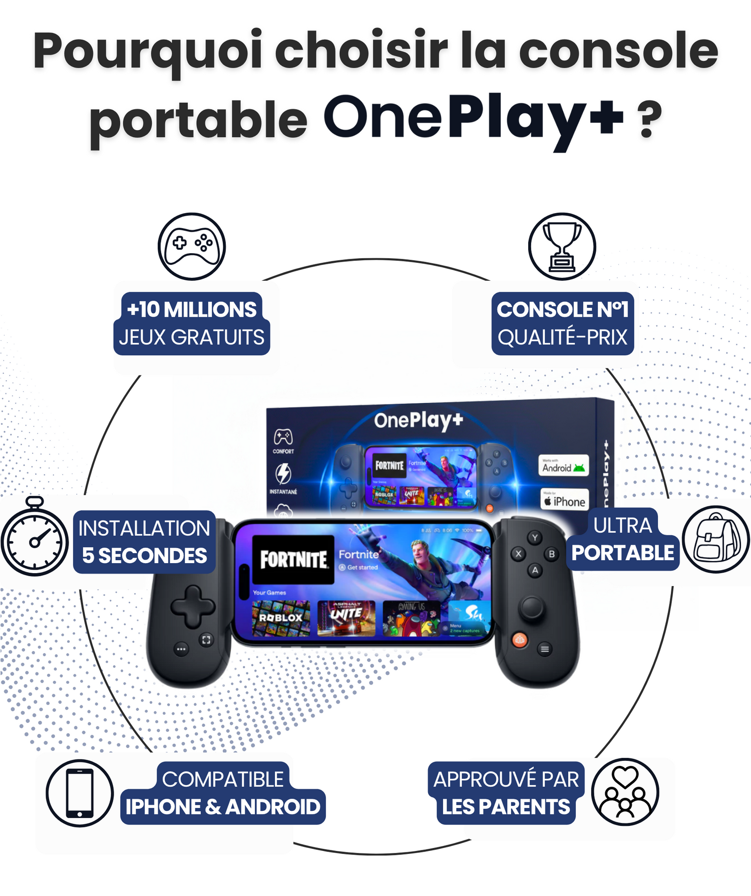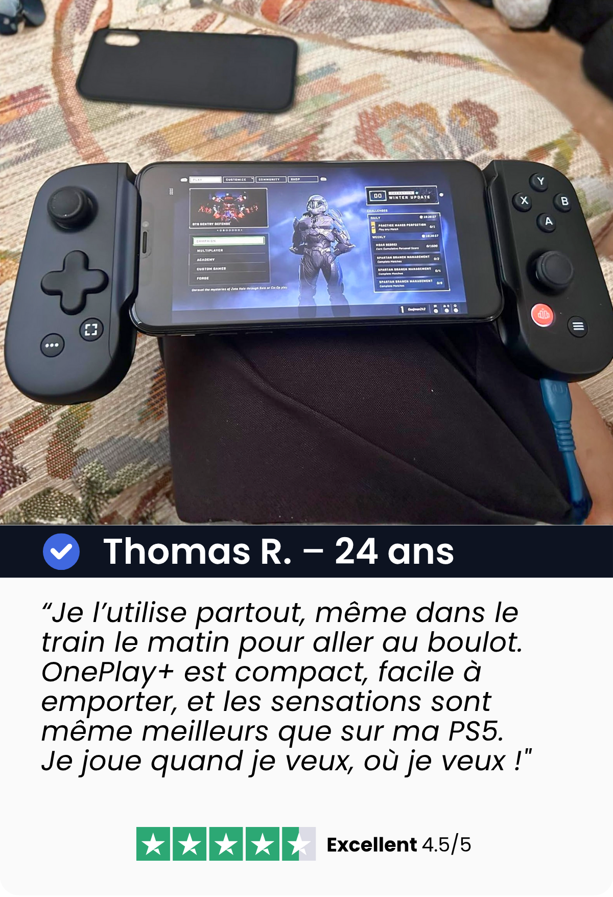 Oui. OnePlay+ fonctionne avec tous les smartphones Android récents (USB-C) et les iPhone (Lightning).